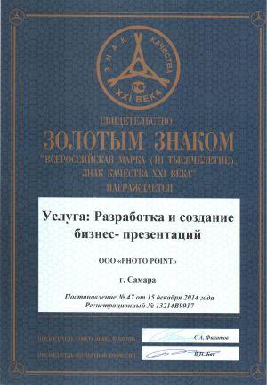 По итогам работы комиссии конкурса компания "Photo Point" награждена ЗОЛОТЫМ ЗНАКОМ « ВСЕРОССИЙСКАЯ МАРКА (III ТЫСЯЧЕЛЕТИЕ). ЗНАК КАЧЕСТВА XXI ВЕКА»