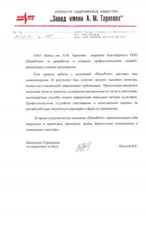 ОАО "Завод им. А.М. Тарасова" выражает благодарность ООО "PhotoPoint" за разработку и создание профессиональной "живой" презентации о нашем предприятии.